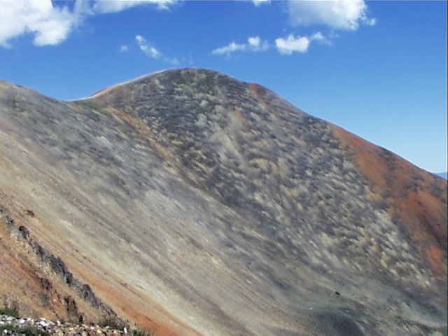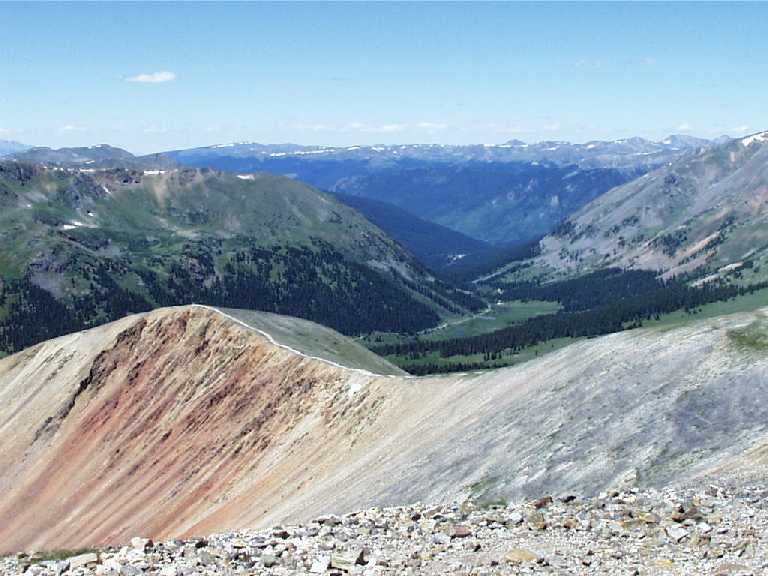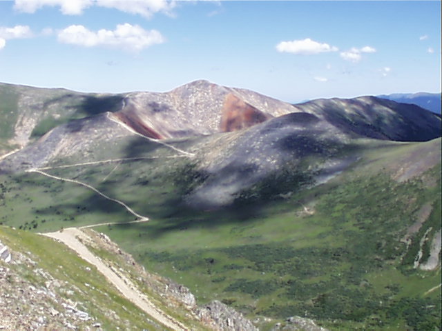 The approach to Red Cone. The road rides the top of the red ridge to the right.